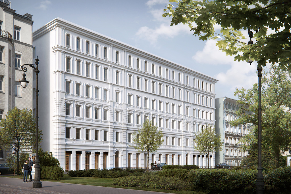 Со стороны Старомонетного переулка расположен бывший доходный дом. Его белый фасад в стиле московского модерна украшен лепными элементами декора. Светлую цветовую гамму продолжает особняк всего на 8 квартир, расположенный во внутреннем дворе. Интерьеры квартир и входных групп в этих домах выполнены в стиле «современная классика» по проекту бюро «Цимайло, Ляшенко и партнеры».