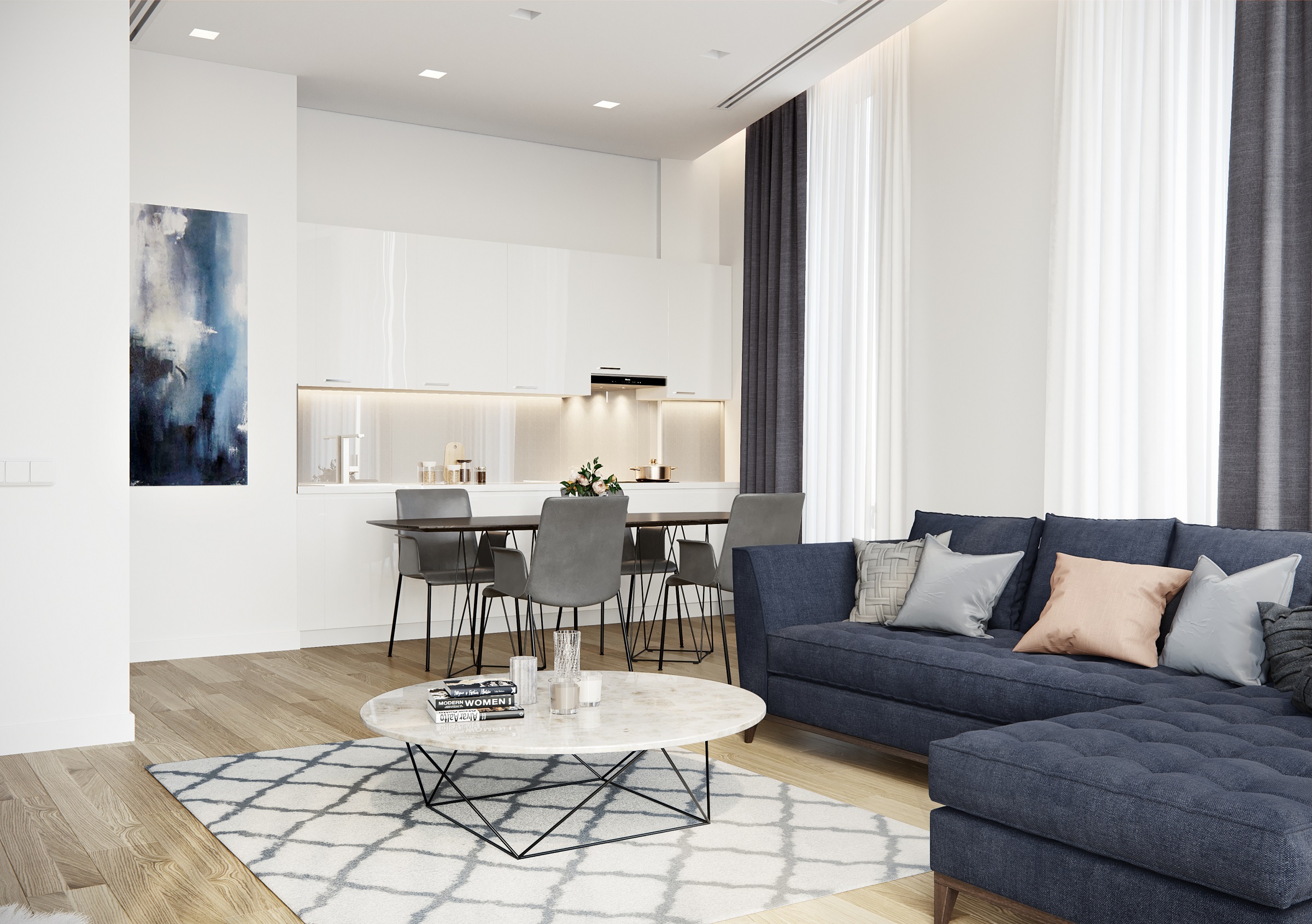 Все апартаменты предлагаются с высококачественной финишной отделкой, включающей оборудованные ванные комнаты, кухни со встроенной бытовой техникой и готовые гардеробные комнаты. Светлая цветовая гамма интерьеров апартаментов, где доминируют гладкие поверхности белого цвета в сочетании с полами из натурального дуба, позволяет будущим жителям добавить яркие элементы декора и персонализировать пространство в соответствии со своими вкусовыми предпочтениями.