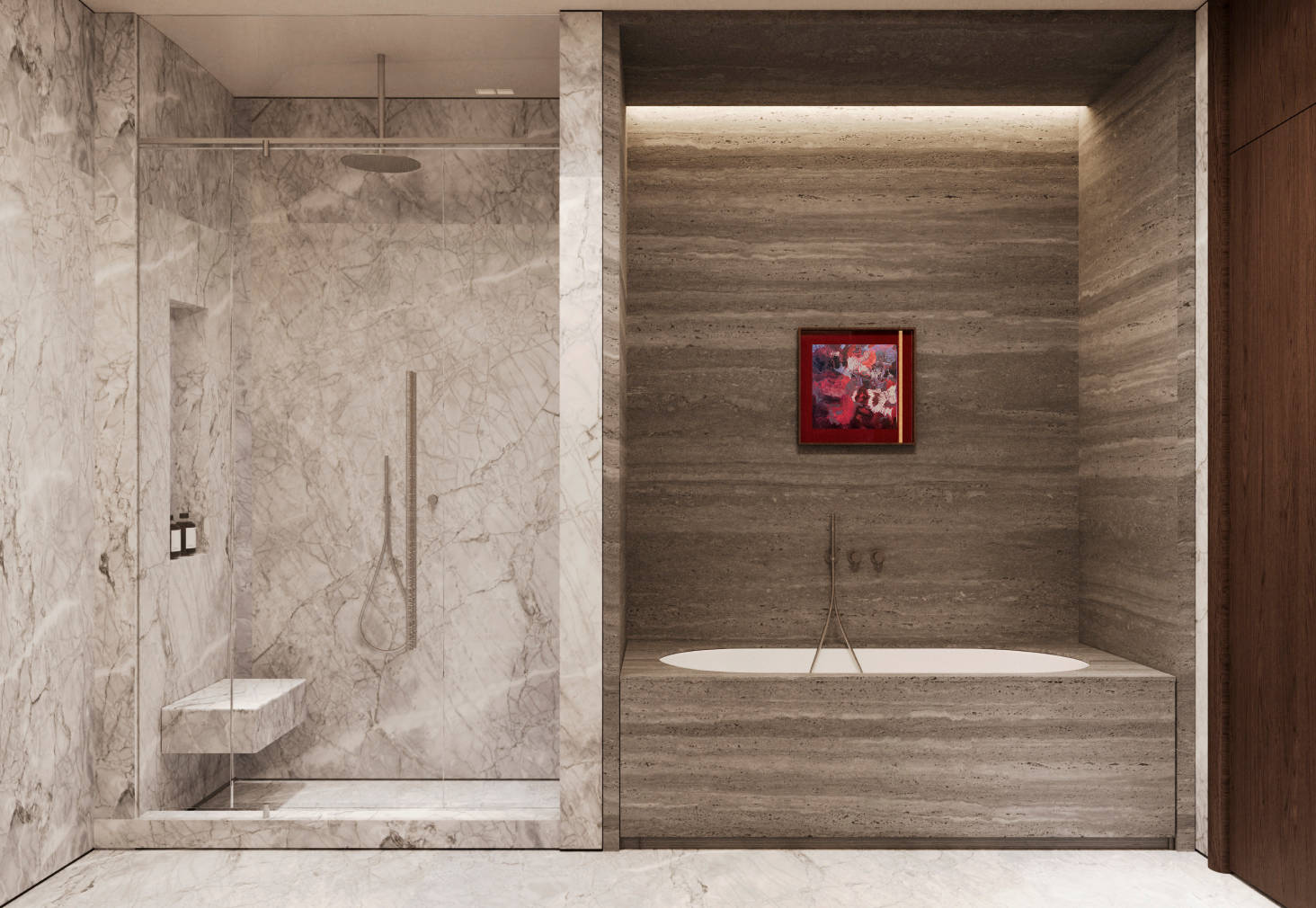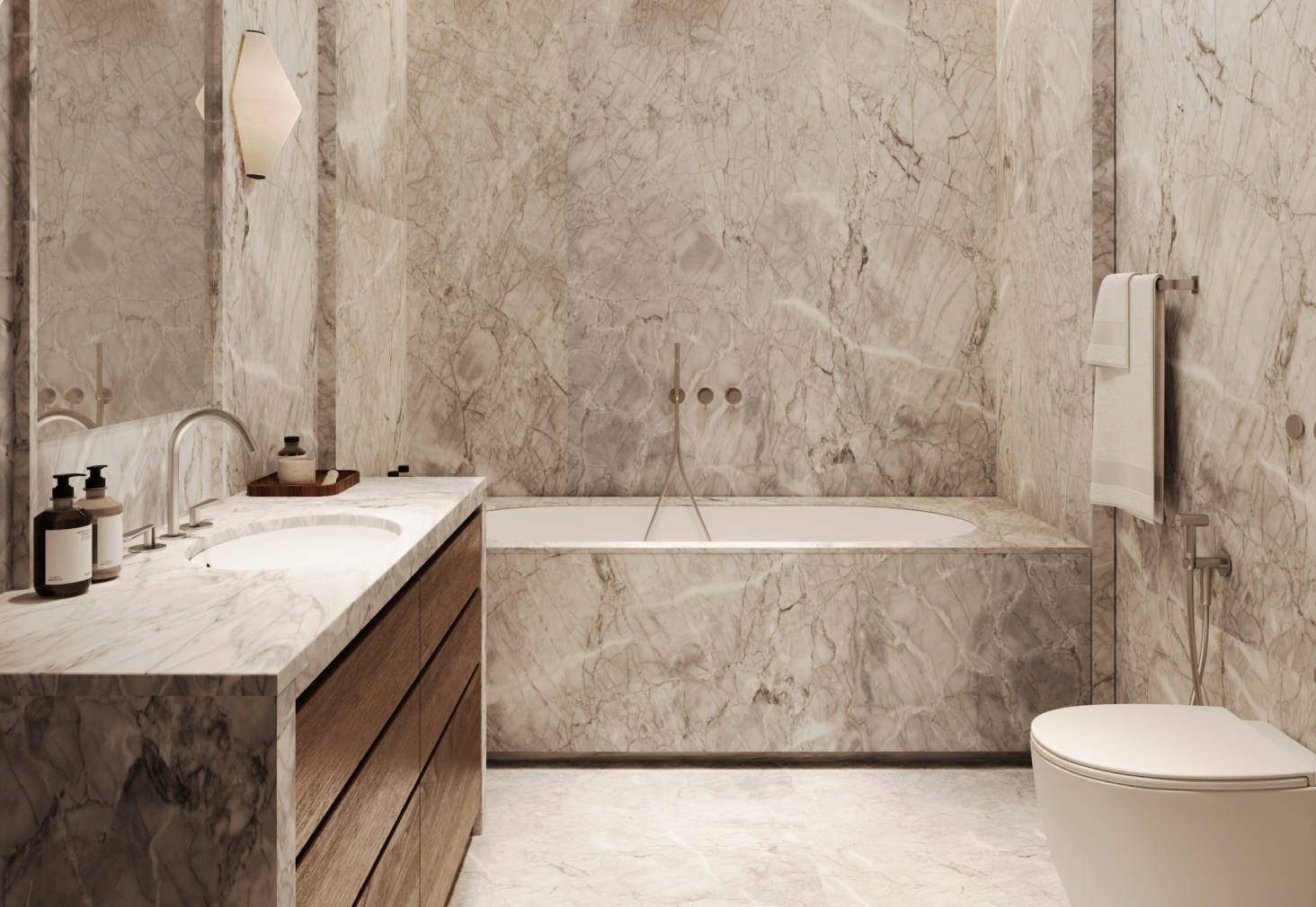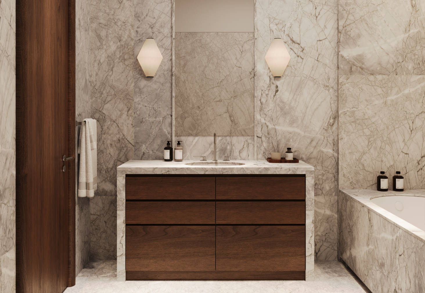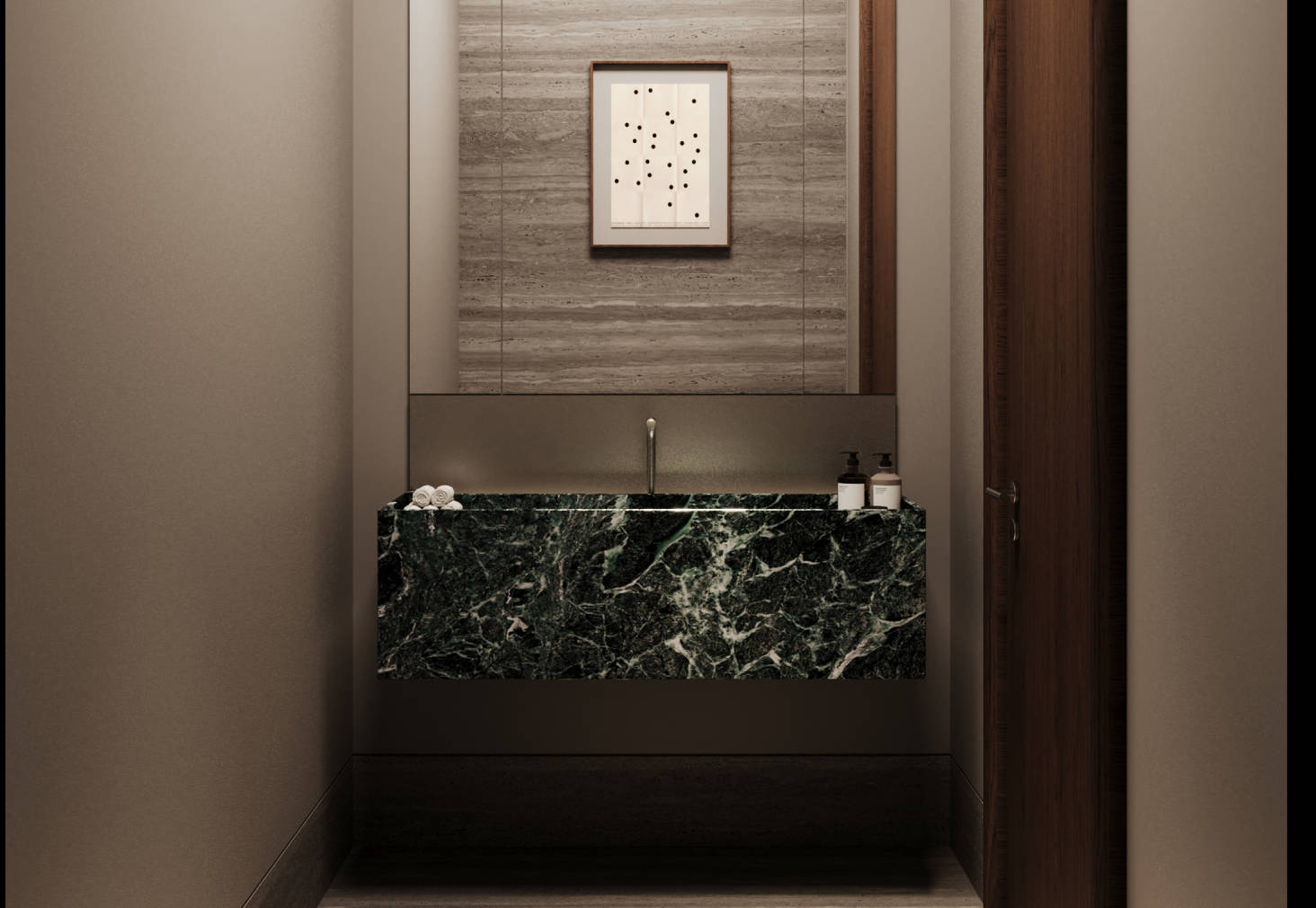 Дизайн лобби вдохновлён итальянскими мотивами 60-х. Мраморный портал раскрывается трапециевидной формой, стойка из широкоформатной керамики — та же, что на фасаде — становится якорем пространства. Входные двери отсылают к Villa Necchi Campiglio в центре Милана. Деревянные панели создают шелковистые переливы на стенах, а мраморная мозаика пола повторяет ритм фасадов.