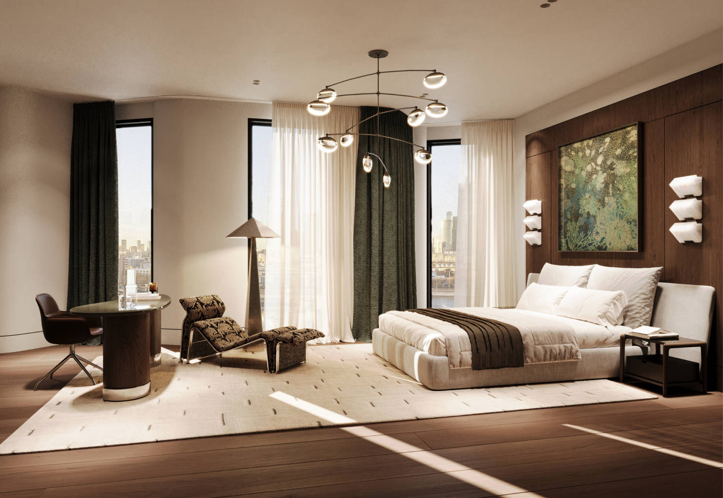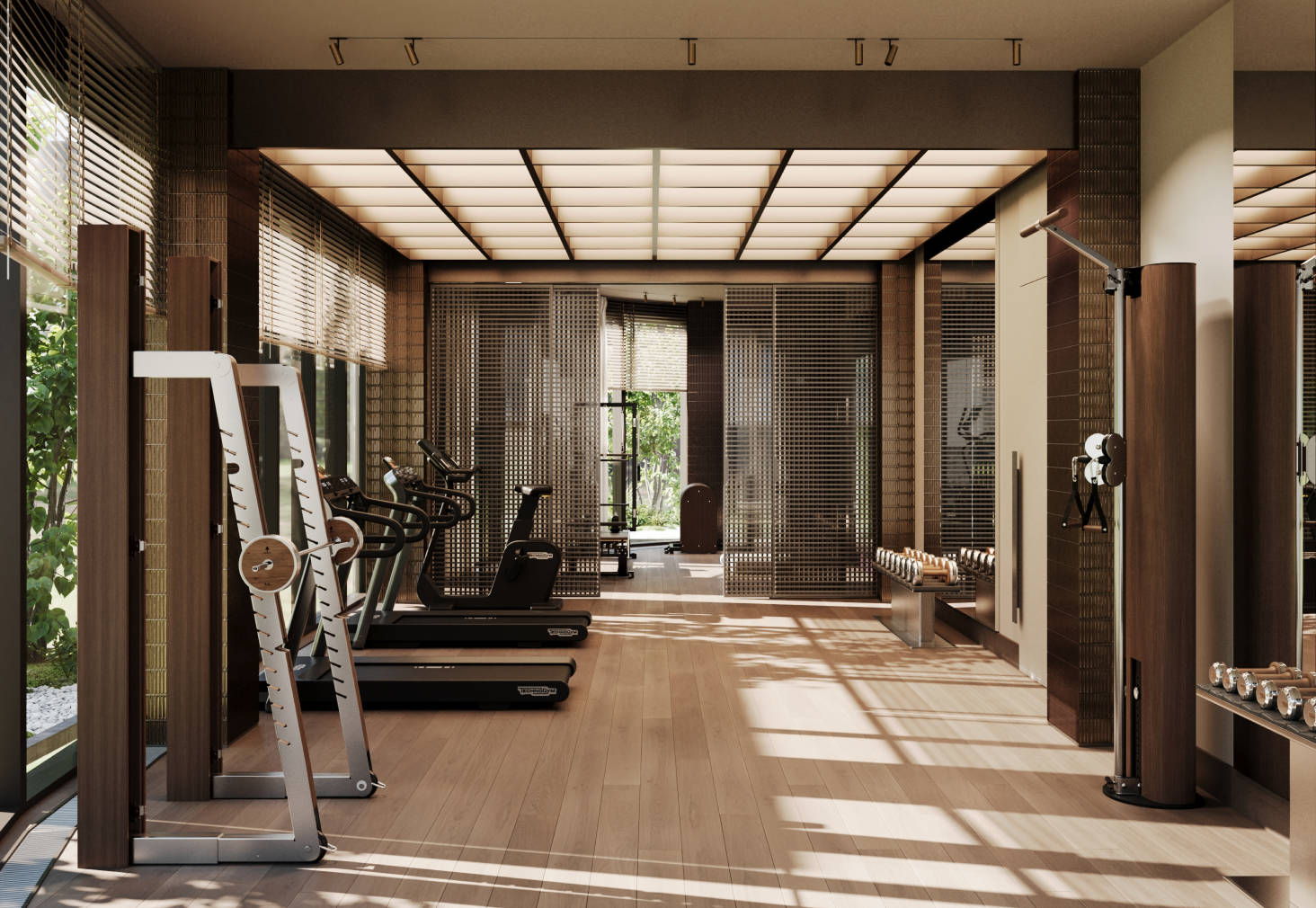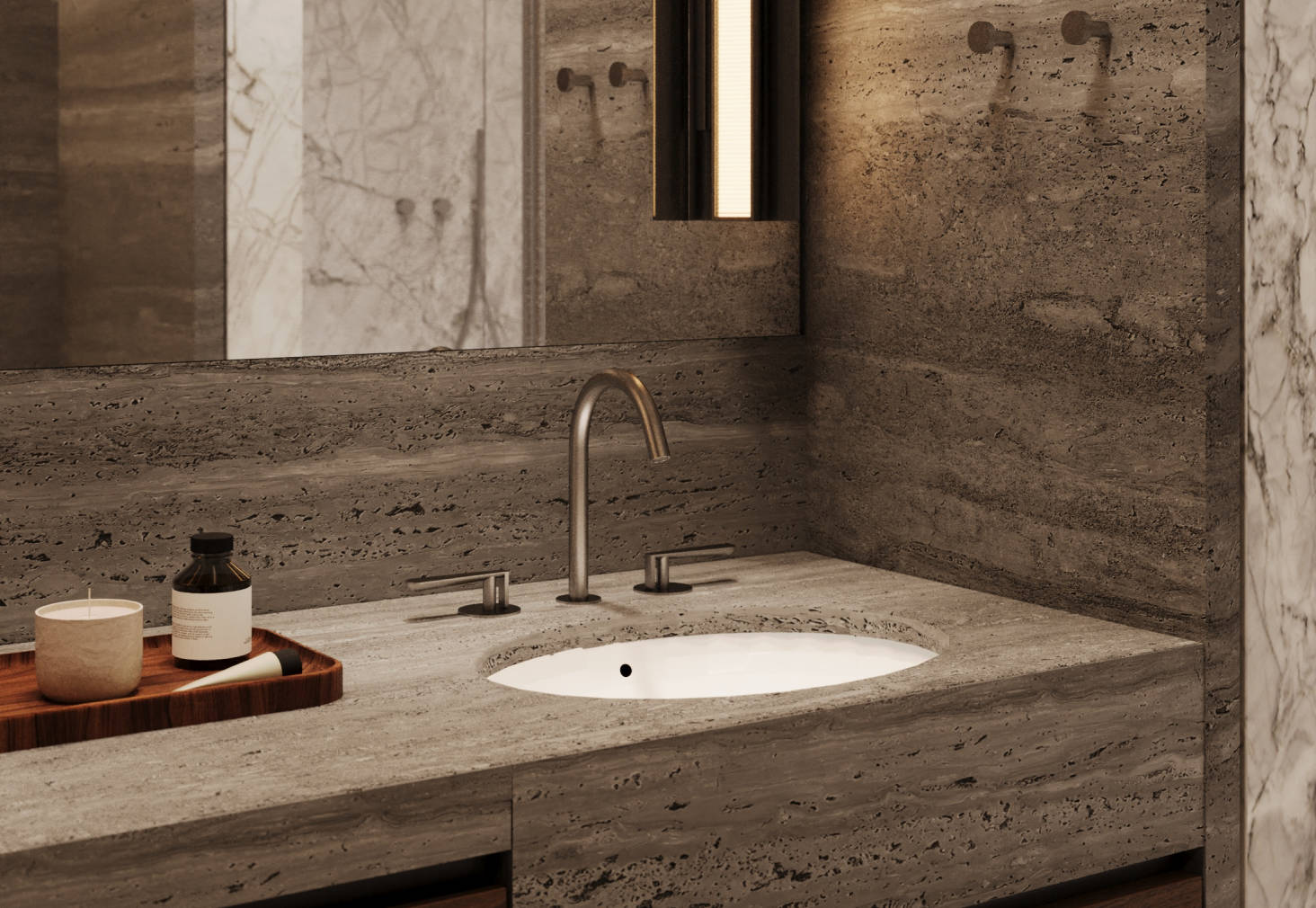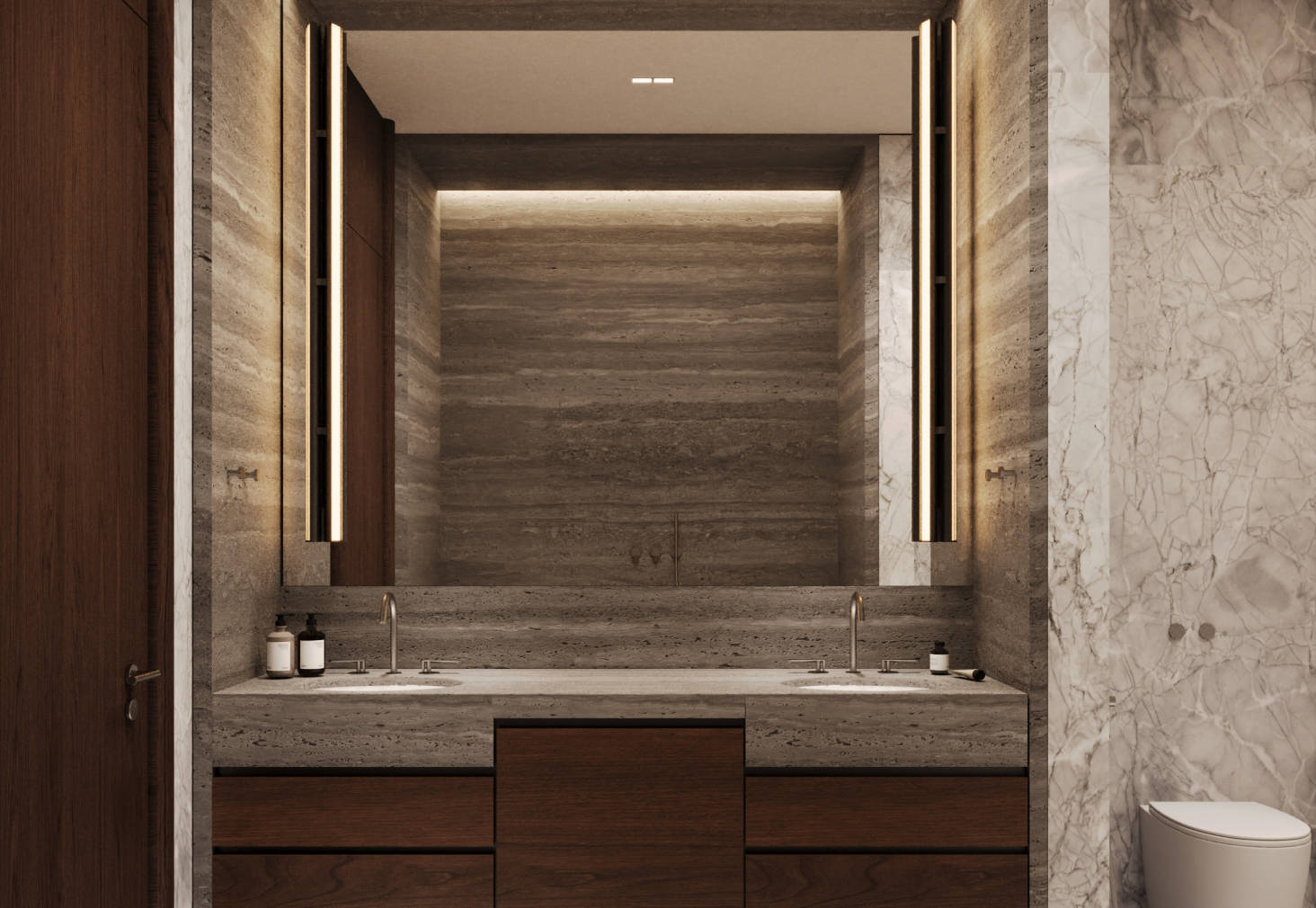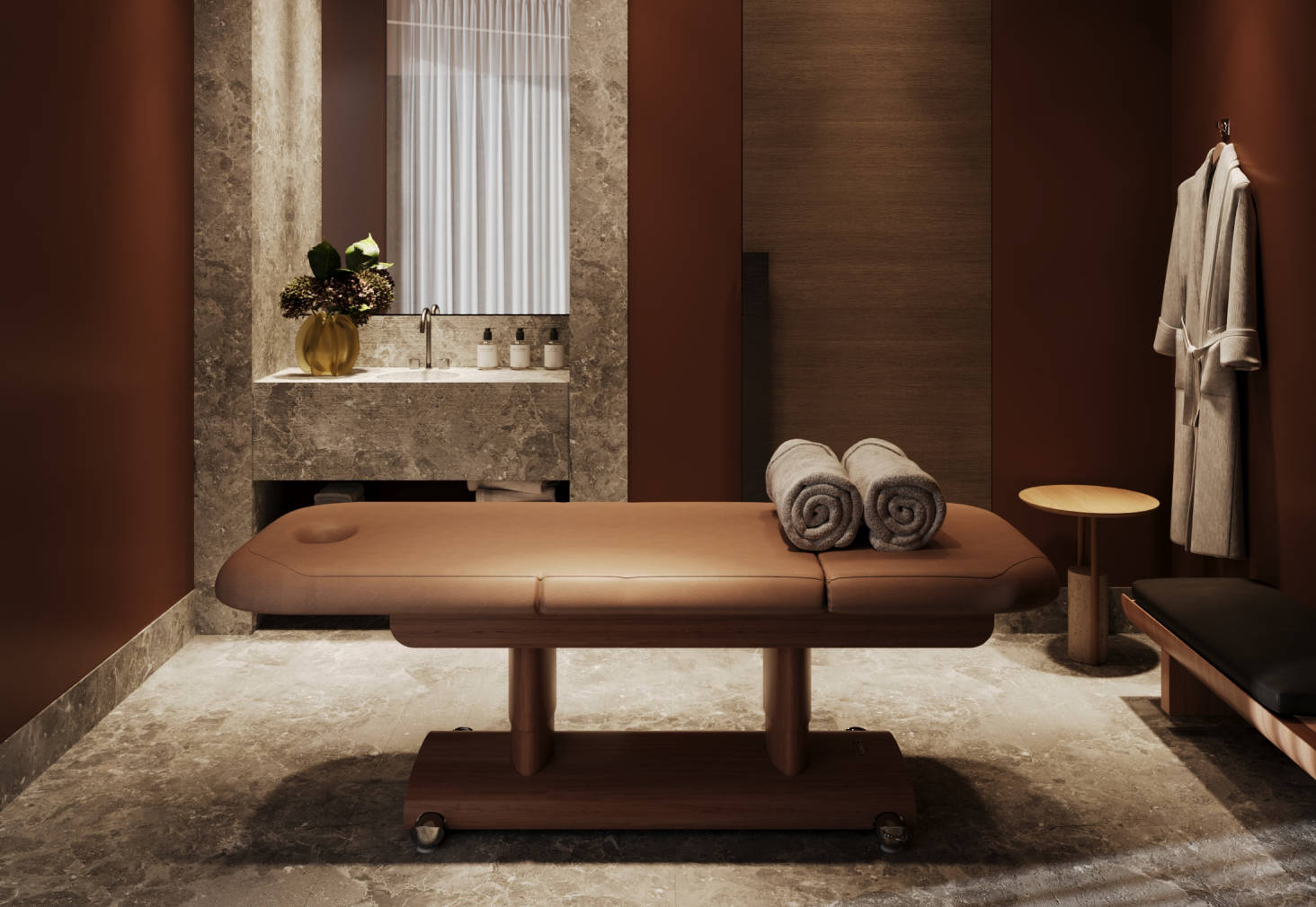 Дизайн лобби вдохновлён итальянскими мотивами 60-х. Мраморный портал раскрывается трапециевидной формой, стойка из широкоформатной керамики — та же, что на фасаде — становится якорем пространства. Входные двери отсылают к Villa Necchi Campiglio в центре Милана. Деревянные панели создают шелковистые переливы на стенах, а мраморная мозаика пола повторяет ритм фасадов.