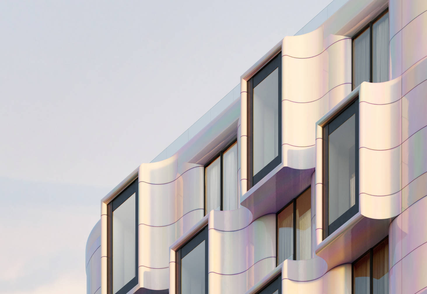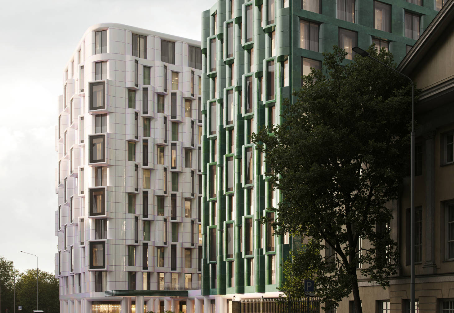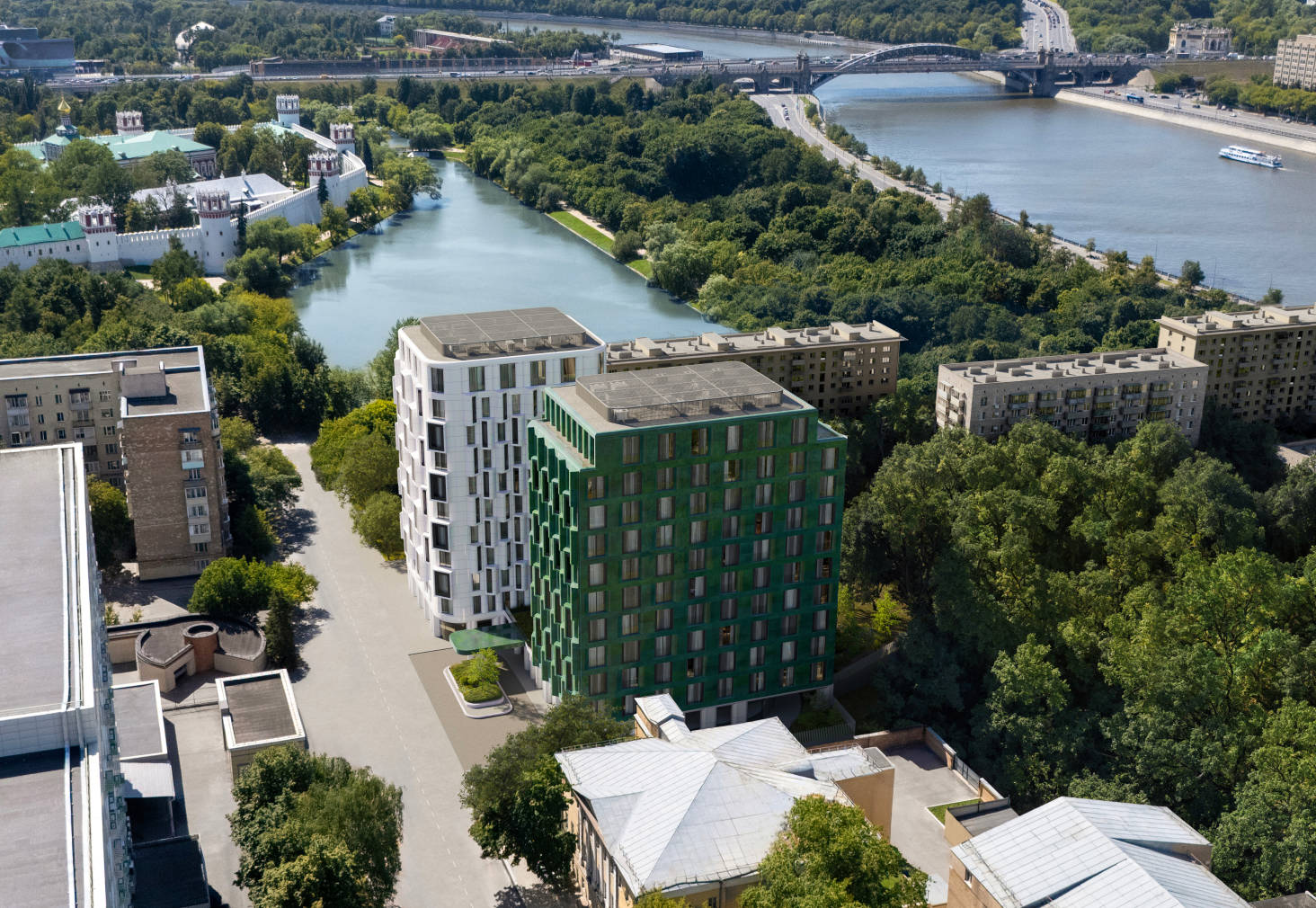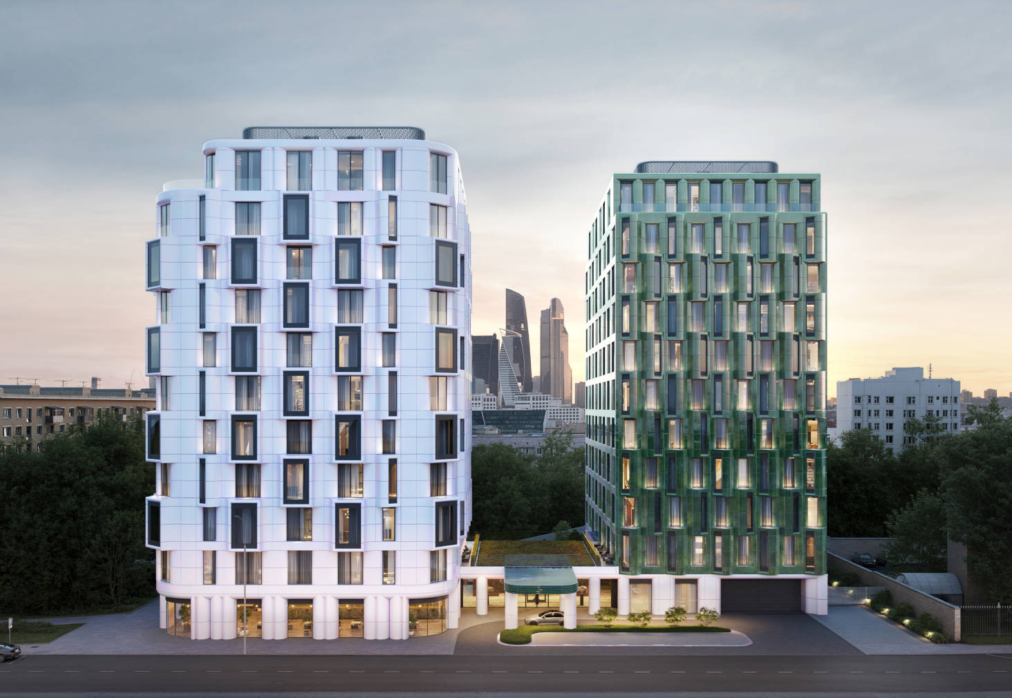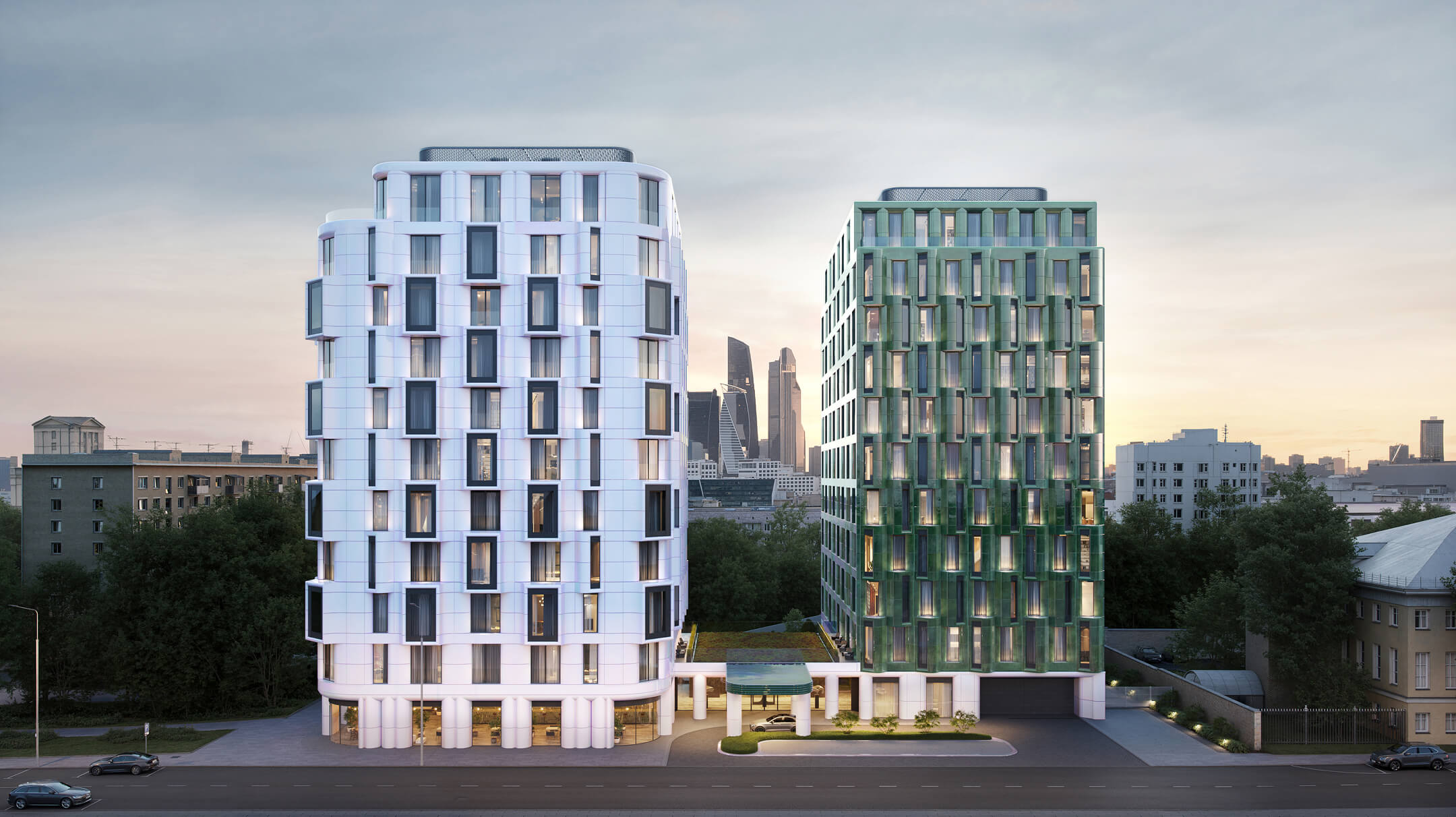 Два объёма — белоснежный и изумрудный — словно застывшая рифма в архитектурной поэме. Жемчужная башня напоминает соцветие белого пиона, чьи лепестки разворачиваются навстречу свету Новодевичьего пруда. Зелёная — изумрудное перо в утренней росе, его графичные линии устремлены к небу.