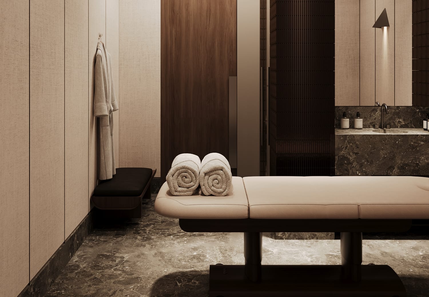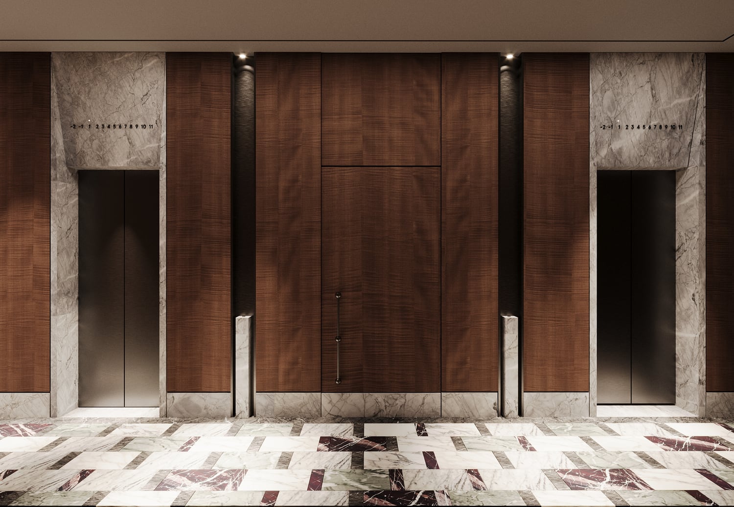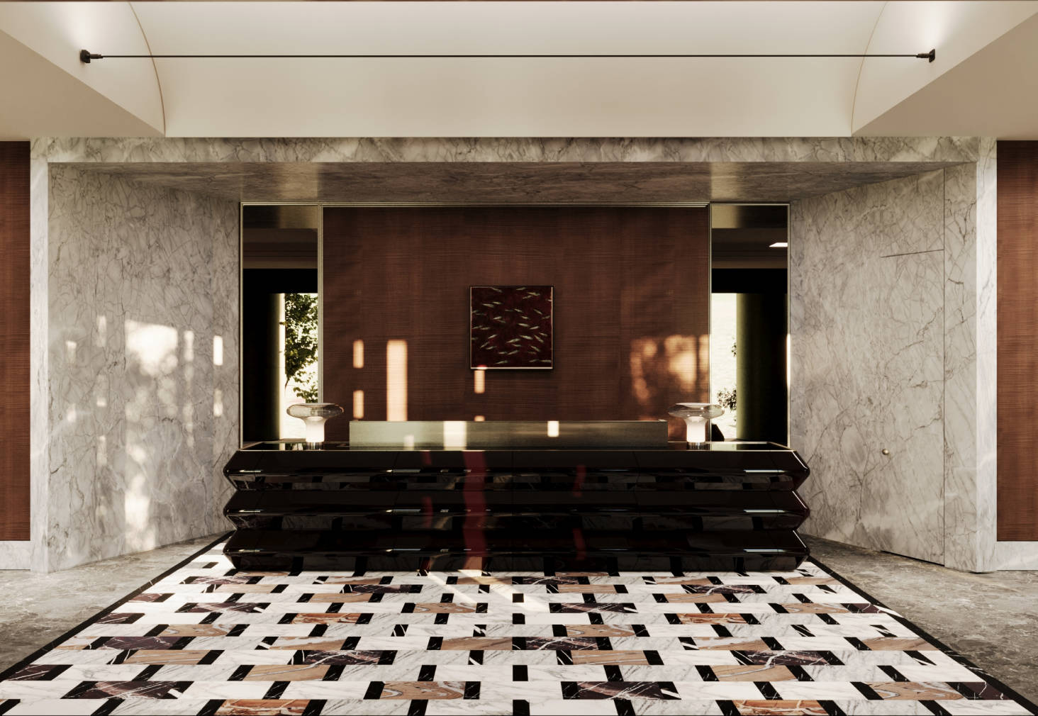 Дизайн лобби вдохновлён итальянскими мотивами 60-х. Мраморный портал раскрывается трапециевидной формой, стойка из широкоформатной керамики — та же, что на фасаде — становится якорем пространства. Входные двери отсылают к Villa Necchi Campiglio в центре Милана. Деревянные панели создают шелковистые переливы на стенах, а мраморная мозаика пола повторяет ритм фасадов.