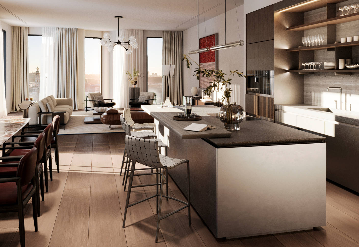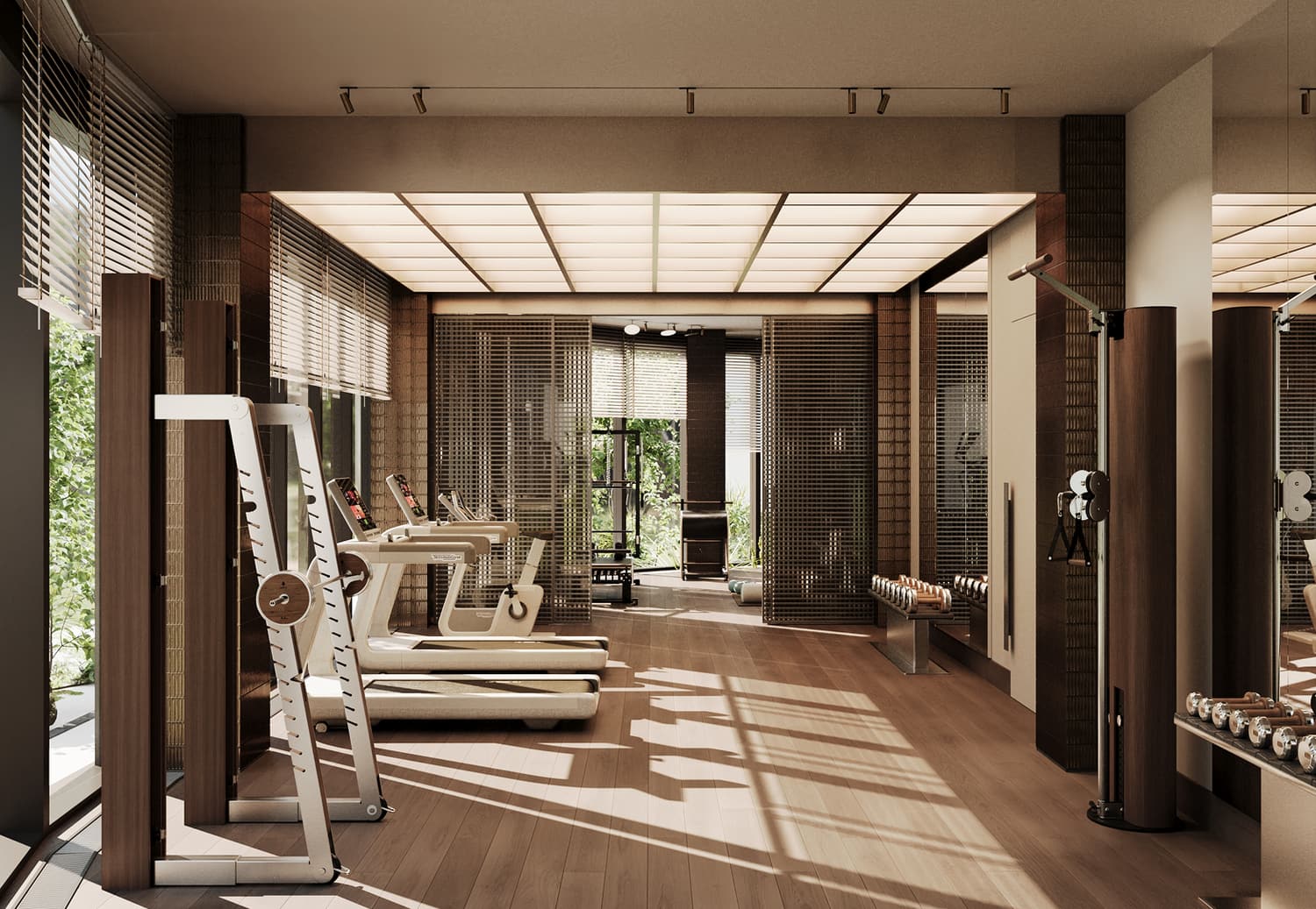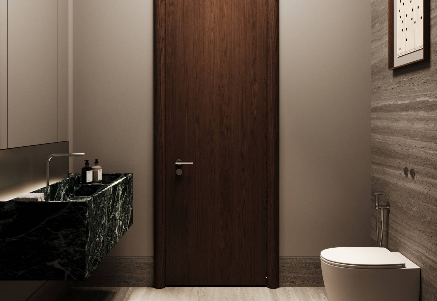 Дизайн лобби вдохновлён итальянскими мотивами 60-х. Мраморный портал раскрывается трапециевидной формой, стойка из широкоформатной керамики — та же, что на фасаде — становится якорем пространства. Входные двери отсылают к Villa Necchi Campiglio в центре Милана. Деревянные панели создают шелковистые переливы на стенах, а мраморная мозаика пола повторяет ритм фасадов.