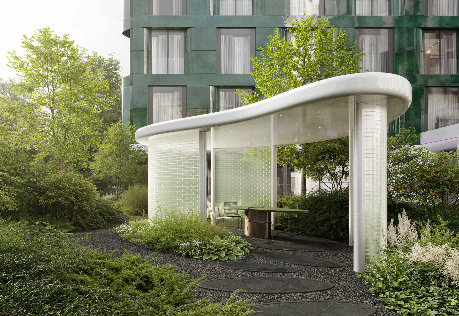 Два объёма — белоснежный и изумрудный — словно застывшая рифма в архитектурной поэме. Жемчужная башня напоминает соцветие белого пиона, чьи лепестки разворачиваются навстречу свету Новодевичьего пруда. Зелёная — изумрудное перо в утренней росе, его графичные линии устремлены к небу.